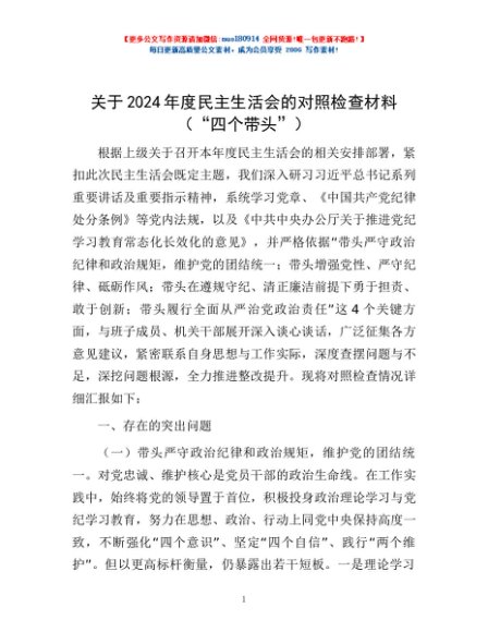 / 关于2024年度民主生活会的对照检查材料(“四个带头”)