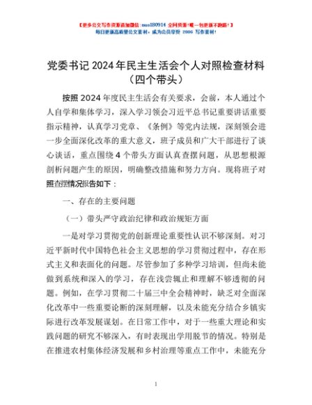/ 党委书记2024年民主生活会个人对照检查材料(四个带头)