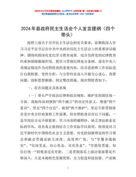 / 2024年县政府民主生活会个人发言提纲(四个带头)