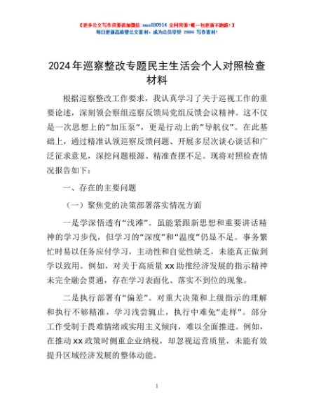 / 2024年巡察整改专题民主生活会个人对照检查材料