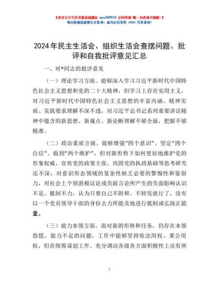 / 2024年民主生活会、组织生活会查摆问题、批评和自我批评意见汇总