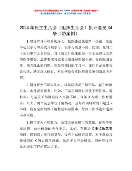 / 2024年民主生活会(组织生活会)批评意见34条(带案例)