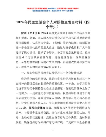 / 2024年民主生活会个人对照检查发言材料(四个带头)