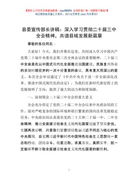 / 县委宣传部长讲稿:深入学习贯彻二十届三中全会精神,共谱县域发展新篇章