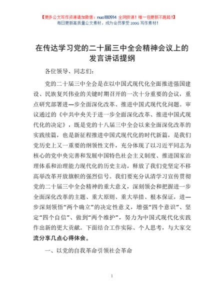 / 在传达学习党的二十届三中全会精神会议上的发言讲话提纲