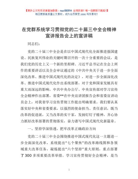 / 在党群系统学习贯彻党的二十届三中全会精神宣讲报告会上的宣讲稿