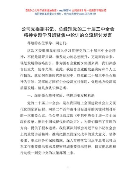 / 公司党委副书记、总经理党的二十届三中全会精神专题学习班暨集中轮训的交流研讨发言