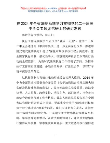 / 在2024年全省法院系统学习贯彻党的二十届三中全会专题读书班上的研讨发言