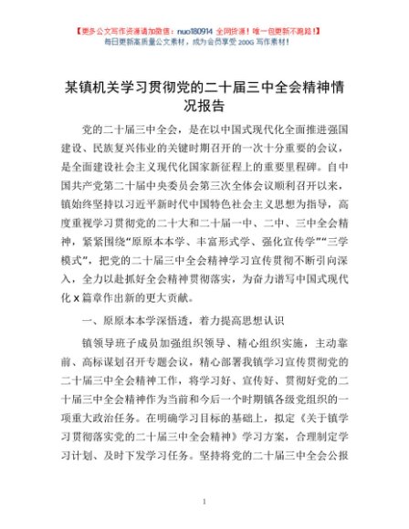 / 某镇机关学习贯彻党的二十届三中全会精神情况报告