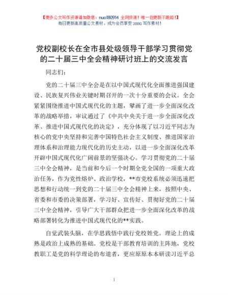 / 党校副校长在全市县处级领导干部学习贯彻党的二十届三中全会精神研讨班上的交流发言