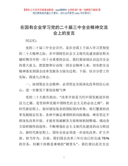 / 在国有企业学习党的二十届三中全会精神交流会上的发言