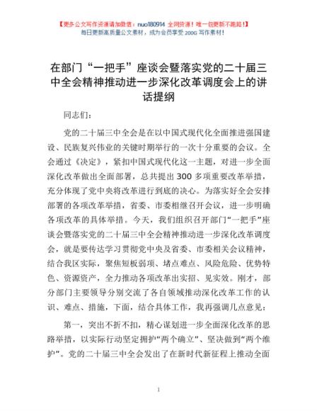 / 在部门“一把手”座谈会暨落实党的二十届三中全会精神推动进一步深化改革调度会上的讲话提纲