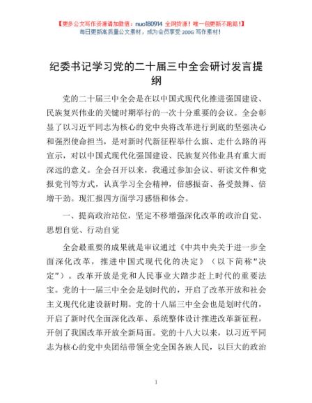 / 纪委书记学习党的二十届三中全会研讨发言提纲