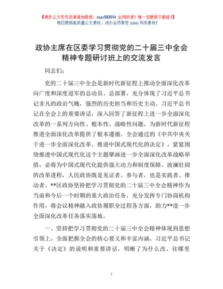 / 政协主席在区委学习贯彻党的二十届三中全会精神专题研讨班上的交流发言