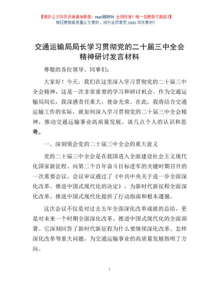 / 交通运输局局长学习贯彻党的二十届三中全会精神研讨发言材料