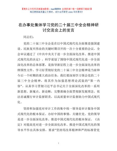 / 在办事处集体学习党的二十届三中全会精神研讨交流会上的发言