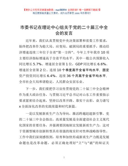 / 市委书记在理论中心组关于党的二十届三中全会的发言