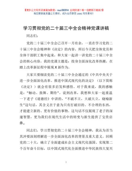 / 学习贯彻党的二十届三中全会精神党课讲稿