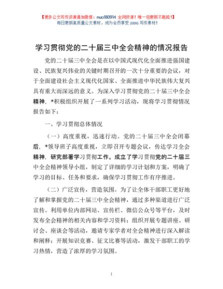 / 学习贯彻党的二十届三中全会精神的情况报告