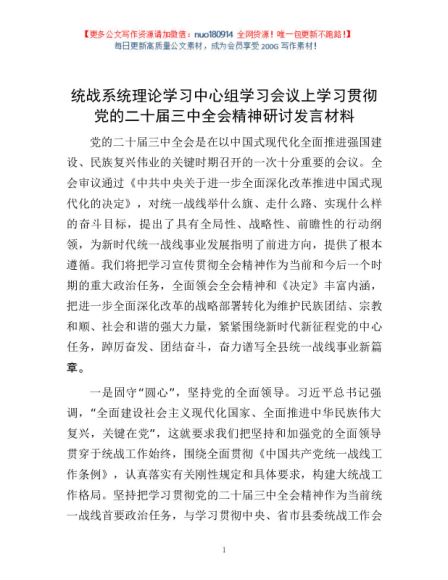 / 统战系统理论学习中心组学习会议上学习贯彻党的二十届三中全会精神研讨发言材料