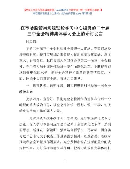 / 在市场监管局党组理论学习中心组党的二十届三中全会精神集体学习会上的研讨发言