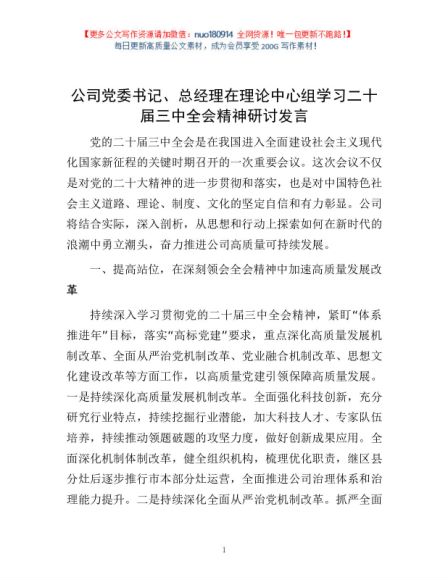 / 公司党委书记、总经理在理论中心组学习二十届三中全会精神研讨发言