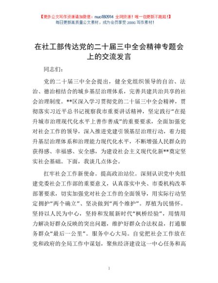 / 在社工部传达党的二十届三中全会精神专题会上的交流发言