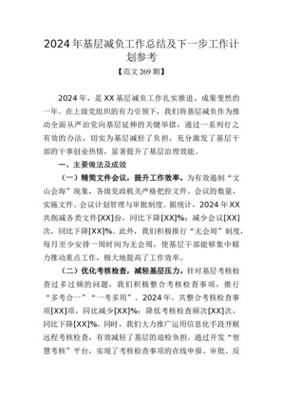 / 范文269期-2024年基层减负工作总结及下一步工作计划参考