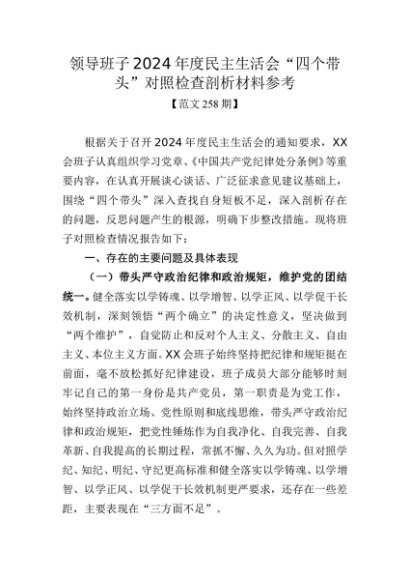 / 范文258期-领导班子2024年度民主生活会“四个带头”对照检查剖析材料参考