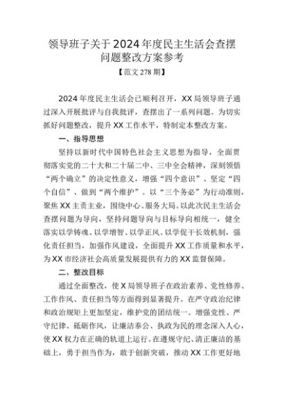 / 范文278期-领导班子关于2024年度民主生活会查摆问题整改方案参考
