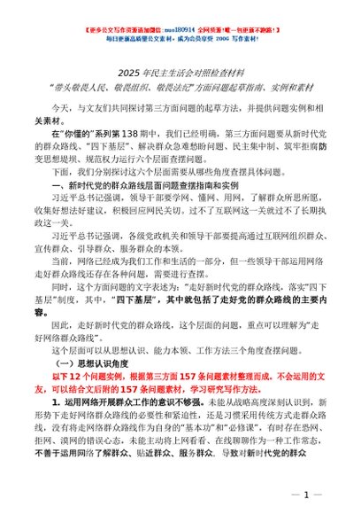 / 第141期(157条)2025年民主生活会对照检查材料“带头敬畏人民、敬畏组织、敬畏法纪”方面问题起草指南、实例和素材