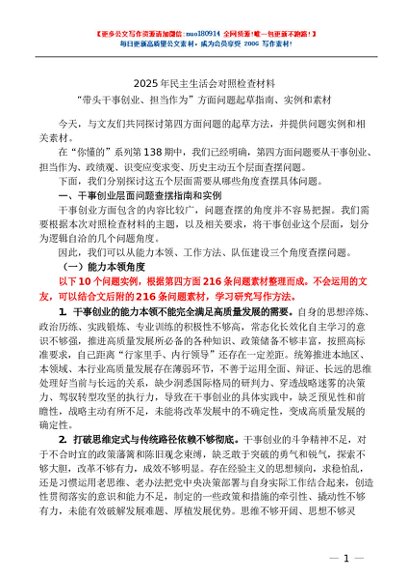 / 第142期(216条)2025年民主生活会对照检查材料“带头干事创业、担当作为”方面问题起草指南、实例和素材